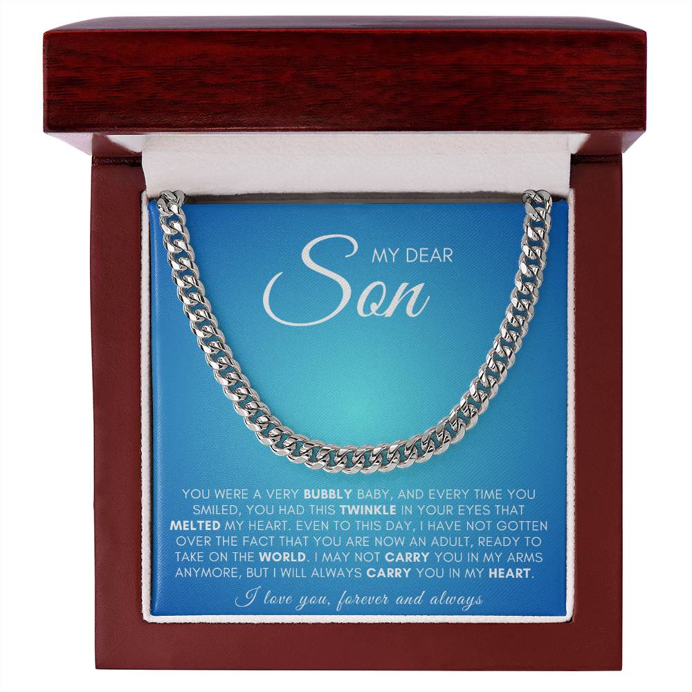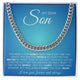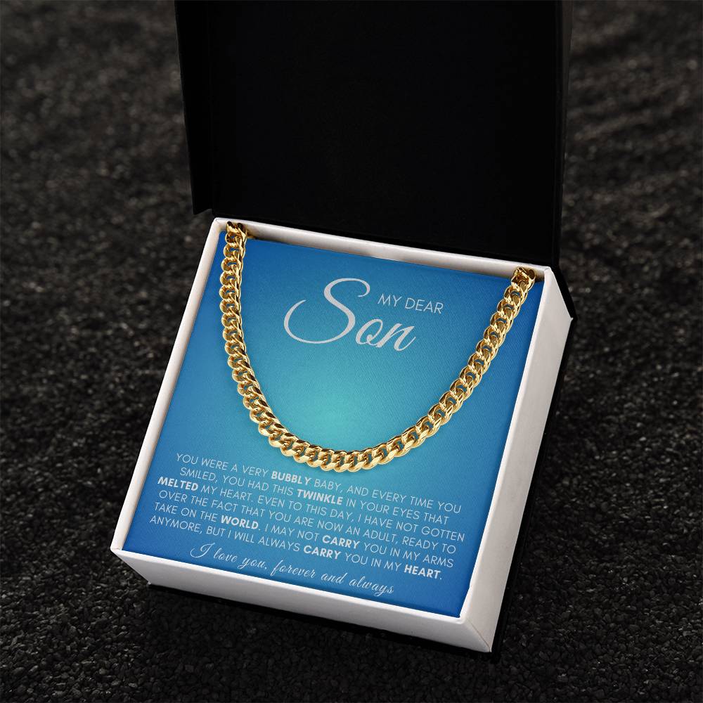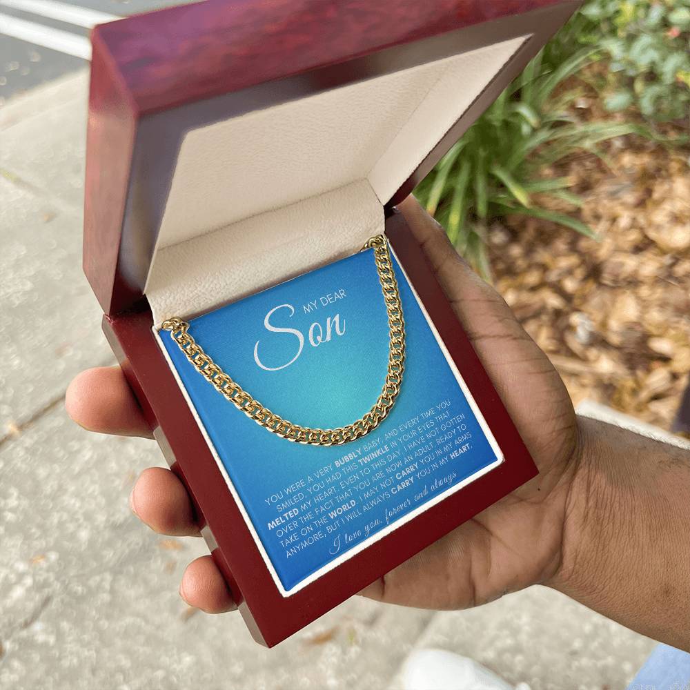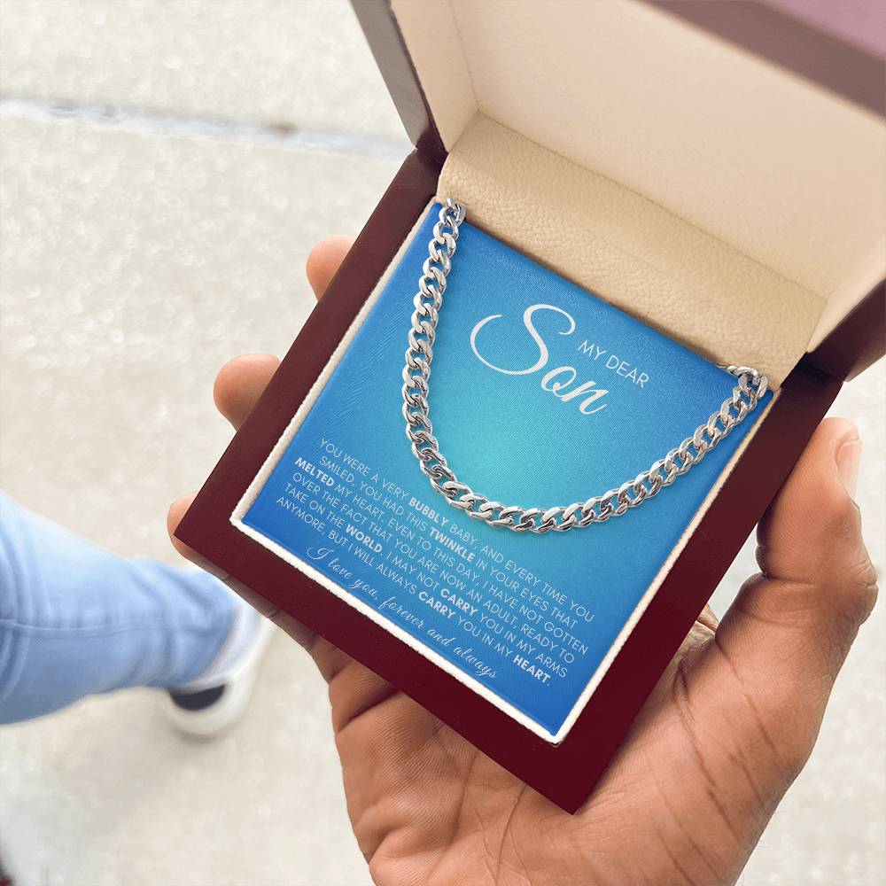 Show your son how much he means to you with the “My Dear Son” Cuban Chain Necklace. This bold and timeless piece is more than jewelry — it’s a symbol of your everlasting love, pride, and connection that will stay with him wherever life takes him.