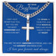 Crafted from polished stainless steel, this cross pendant rests on a sleek Cuban link chain that represents resilience and unity. It’s a gift he’ll wear proudly every day, keeping your love close to his heart.