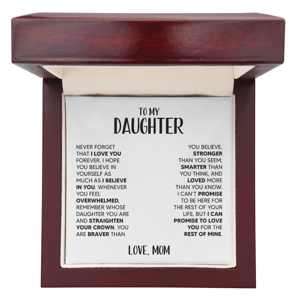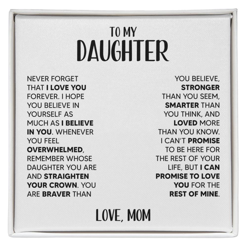 โNever forget that I love you forever. I hope you believe in yourself as much as I believe in you. Whenever you feel overwhelmed, remember whose daughter you are and straighten your crown. You are braver than you believe, stronger than you seem, smarter than you think, and loved more than you know. I canโt promise to be here for the rest of your life, but I can promise to love you for the rest of mine. Love, Mom.โ