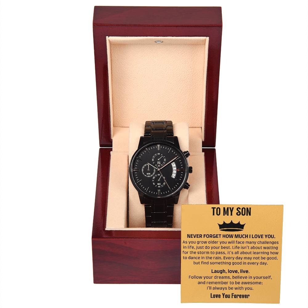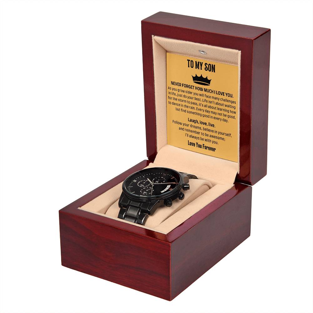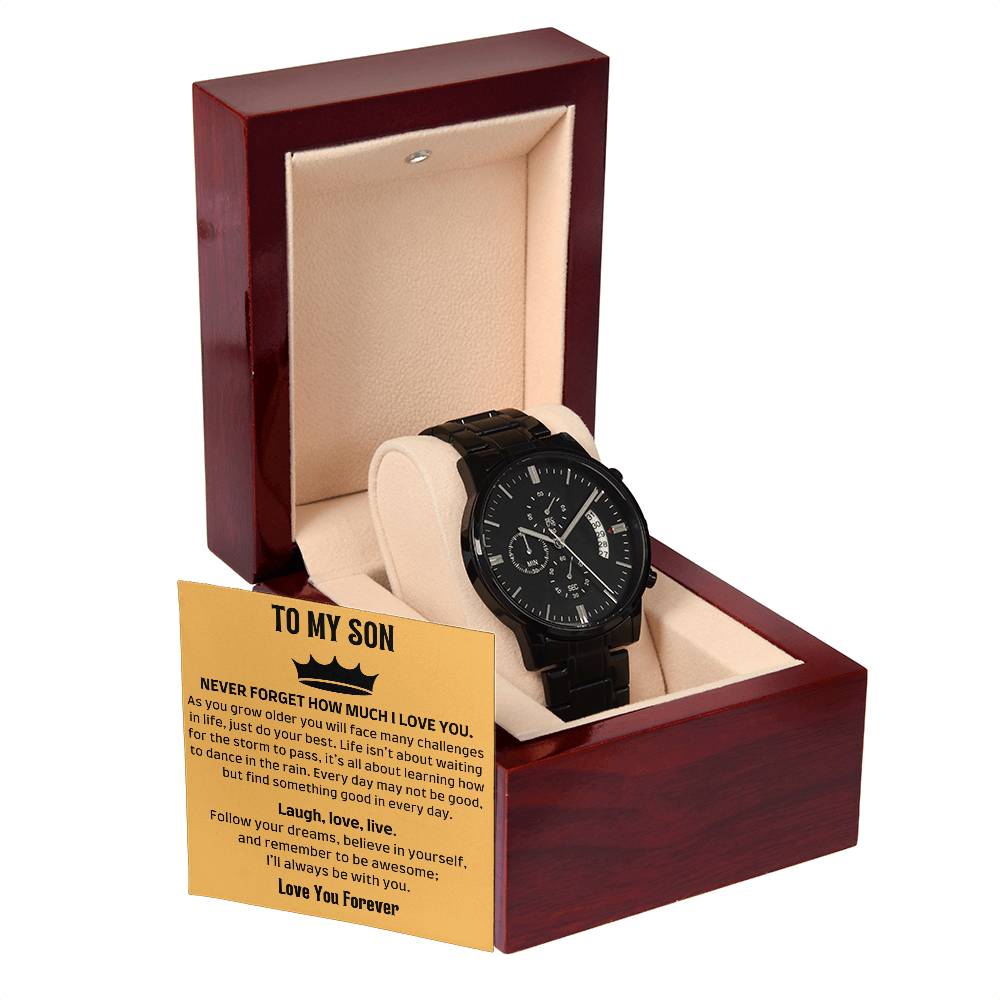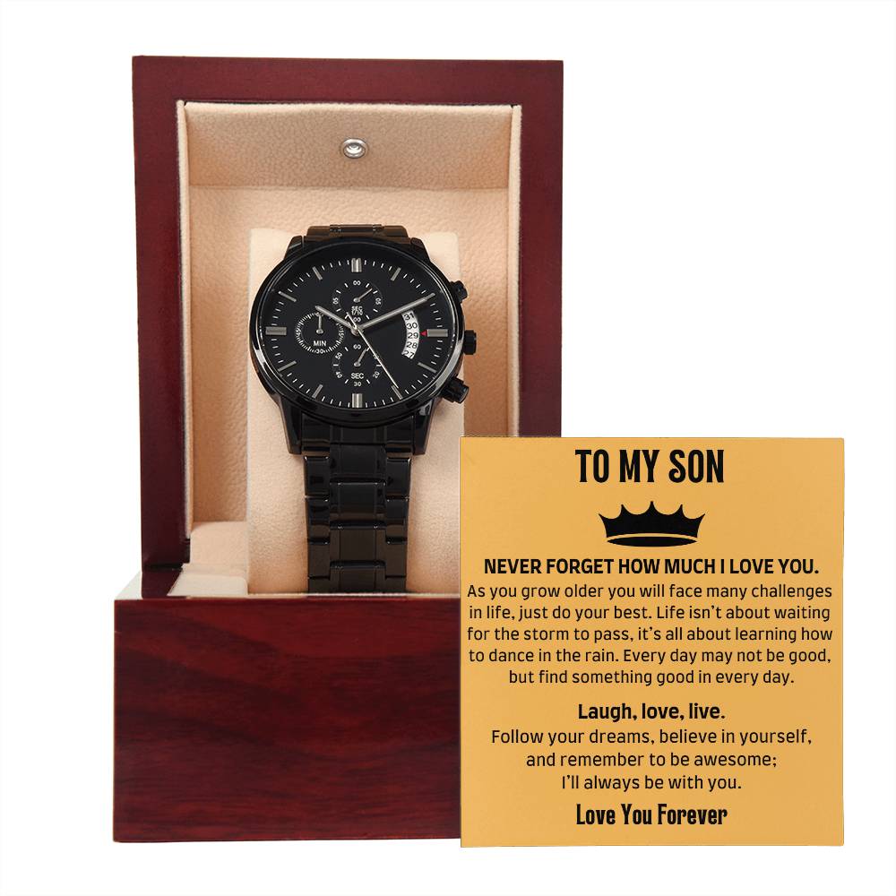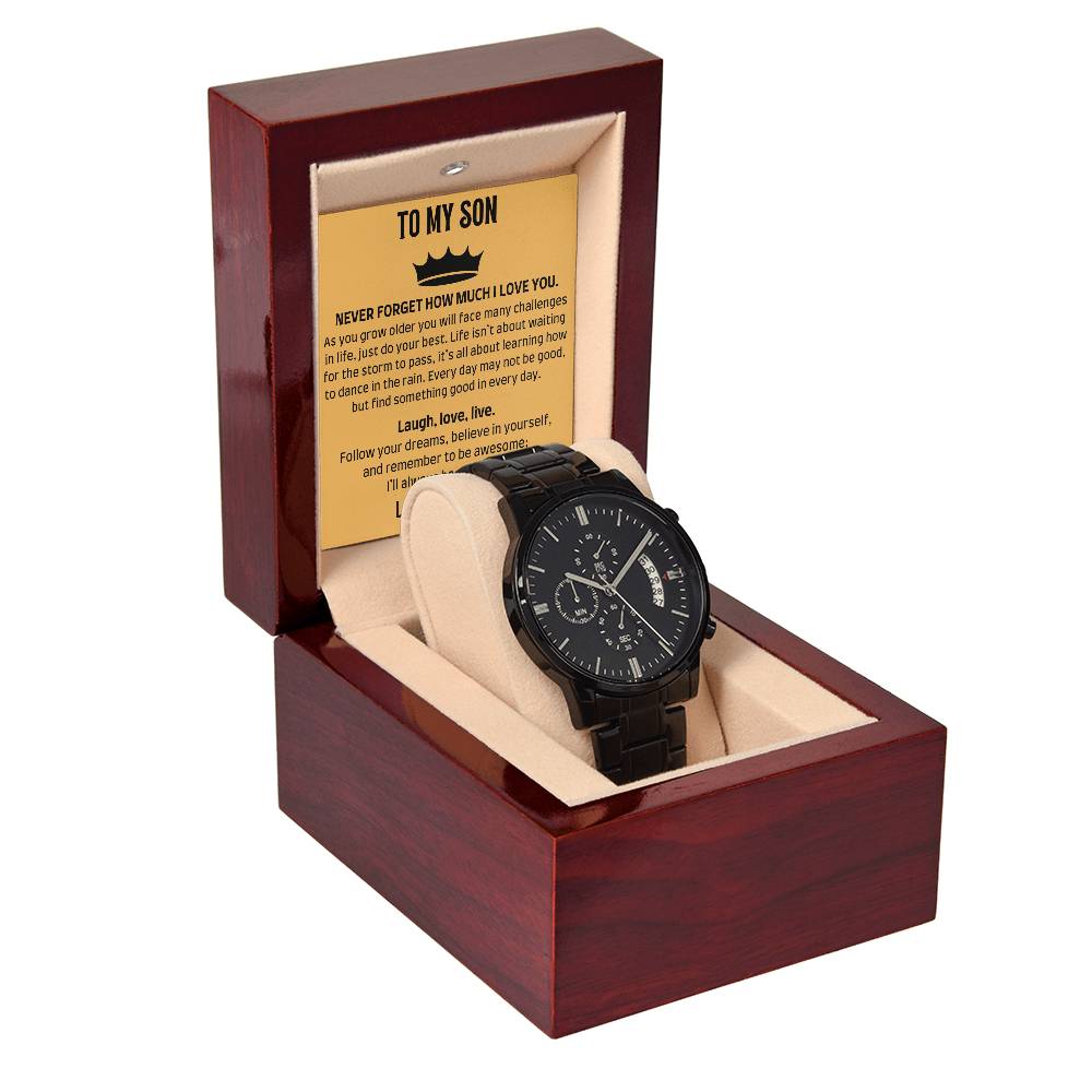 Gift your son a lasting symbol of time, courage, and love with the “To My Son” Black Chronograph Watch. Designed to inspire confidence and remind him of your endless support, this luxury timepiece is perfect for birthdays, graduations, and milestone achievements.